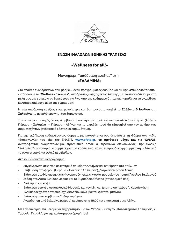 Αρχική » Ανακοινώσεις » «Wellness for all!»Μονοήμερη “απόδραση ευεξίας” στη«ΣΑΛΑΜΙΝΑ»«Wellness for all!»Μονοήμερη “απόδραση ευεξίας” στη«ΣΑΛΑΜΙΝΑ»από Ένωση Φιλάθλων Εθνικής Τράπεζας28 Μαΐου, 202513 Ιανουαρίου, 2026 Αφήστε μια απάντηση Ακύρωση απάντησηςΗ ηλ. διεύθυνση σας δεν δημοσιεύεται. Τα υποχρεωτικά πεδία σημειώνονται με *Όνομα * Email * Ιστότοπος Σχόλιο * Αποθήκευσε το όνομά μου, email, και τον ιστότοπο μου σε αυτόν τον πλοηγό για την επόμενη φορά που θα σχολιάσω. Δ