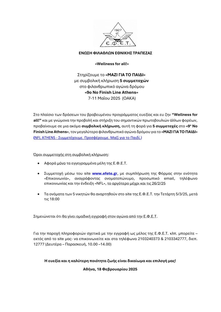 «Wellness for all!»Στηρίζουμε το «ΜΑΖΙ ΓΙΑ ΤΟ ΠΑΙΔΙ» με συμβολική κλήρωση 5 συμμετοχών στο φιλανθρωπικό αγώνα δρόμου